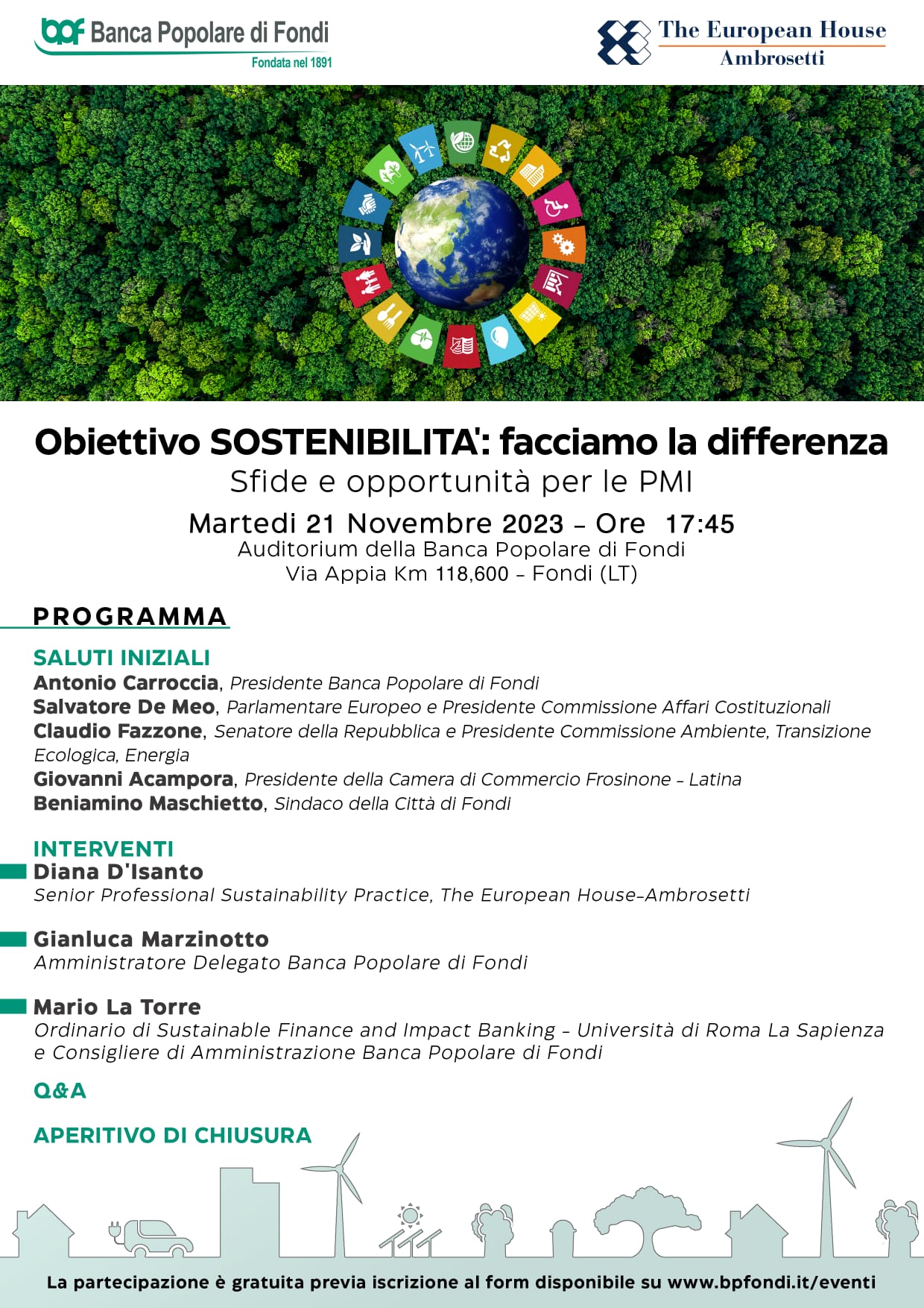 La Banca Popolare di Fondi, in collaborazione con The European House – Ambrosetti, organizza il 21 novembre p.v. l’incontro: “Obiettivo Sostenibilità: facciamo la differenza. Sfide e opportunità per le PMI” presso l’Auditorium della Direzione Generale in Via Appia km 118,600 a Fondi.