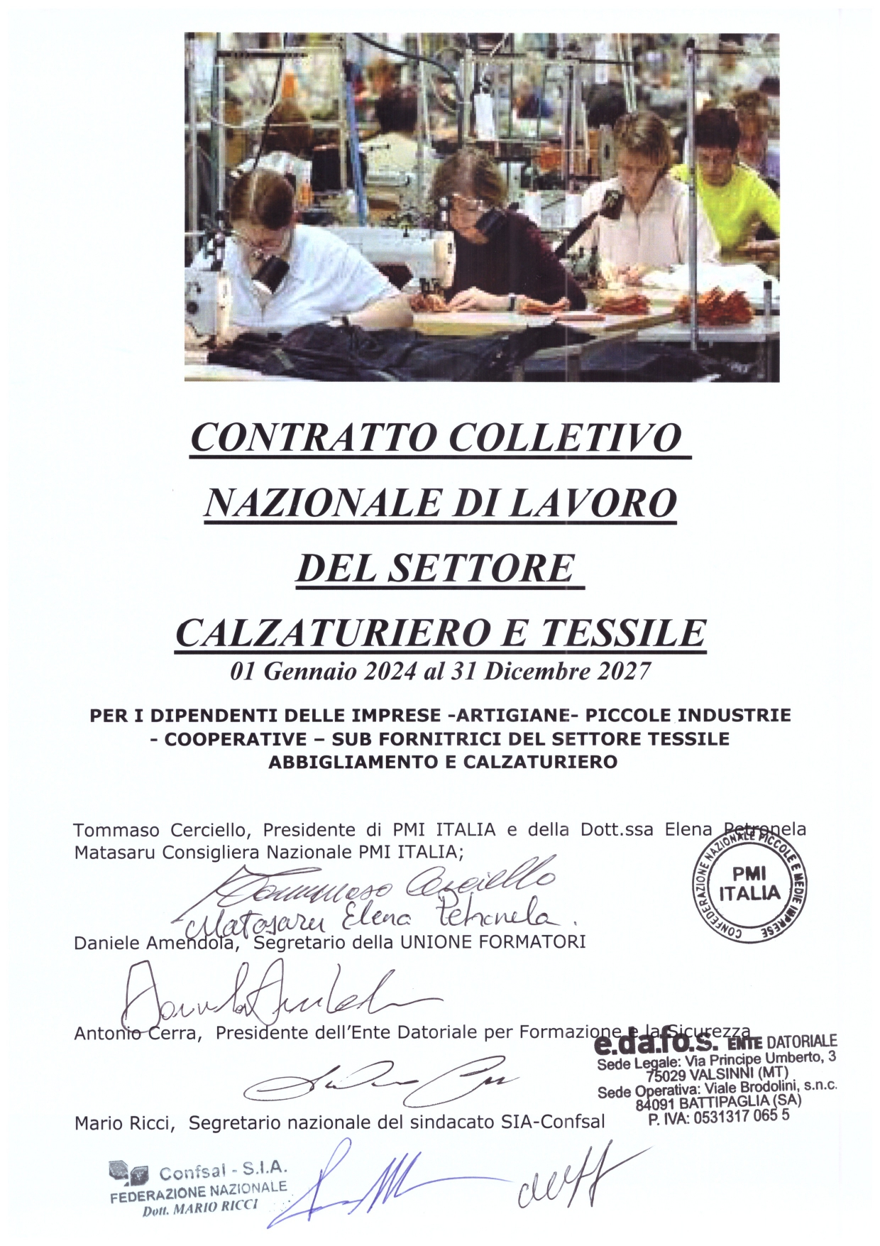 Rinnovati il Contratto Collettivo Nazionale del Lavoro del Settore Calzaturiero e Tessile ed il contratto per i lavoratori del Terzo Settori A sottoscriverlo, la Conf PMI ITALIA rappresentata dal dottor Tommaso Cerciello, Presidente Nazionale Confederale, e della dottoressa Elena Matasaru, Consigliere Nazionale di Conf PMI ITALIA, l’Unione Formatori, rappresentata dal Segretario, Daniele Amendola, Antonio Cerra, Presidente dell’Ente Datoriale per la formazione e la sicurezza, Mario Ricci, Segretario Nazionale del sindacato SIA-CONFSAL